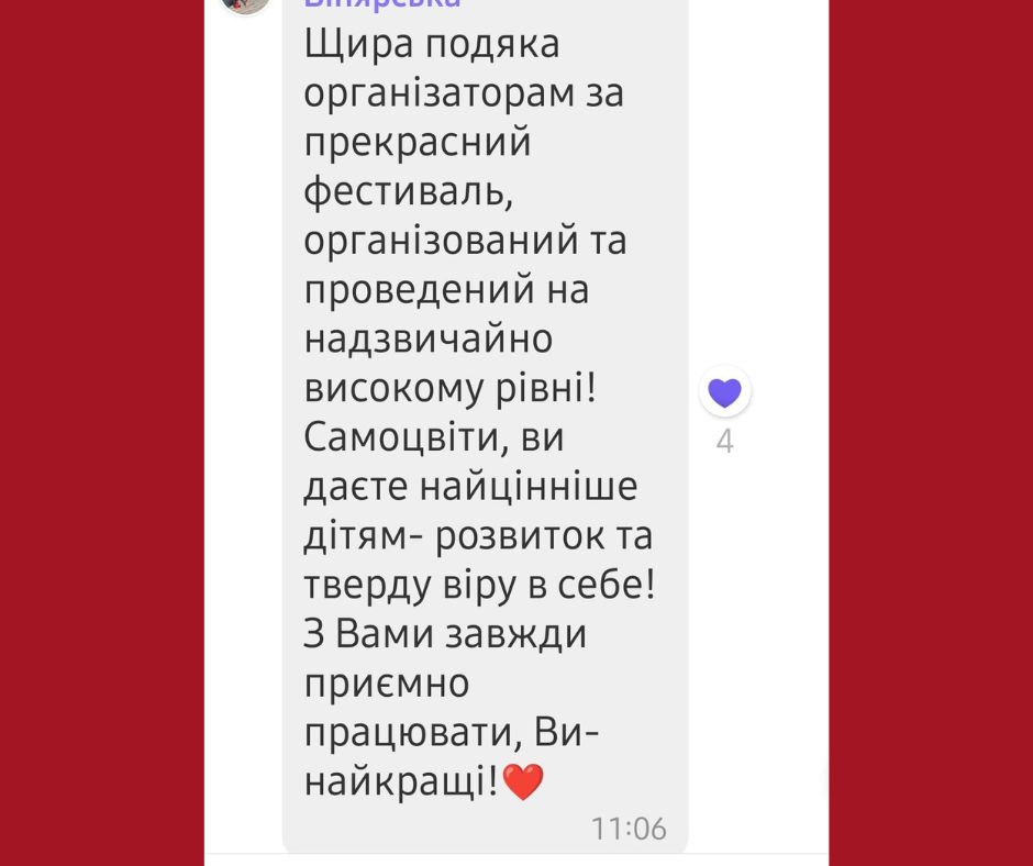 20.01.2026Wrocław, PolskaВисокий рівень організації та чудова атмосфера конкурсуЩиро дякую за високий рівень організації конкурсу! Завдяки залученості вашої команди діти мають чудову можливість відкривати свої таланти, розвивати творчі здібності та вірити у власні можливості. Конкурс проходив у доброзичливій атмосфері, був дуже добре продуманий і залишив у дітей та батьків виключно позитивні враження. Бажаю Вам і всій команді подальших успіхів, натхнення та багатьох нових, прекрасних проєктів. Нехай ваша праця і надалі приносить дітям радість і відчутні результати. Ще раз дякую! ♥️ Колектив «Барвінок», Вроцлав Окрема подяка за привітання з нагоди дня народження! 😍 Тепер усі діти запитують, чи і на їхні дні народження теж будуть конкурси.Oksana Dovhal Children’s Ukrainian Dance Ensemble “Barvinok”